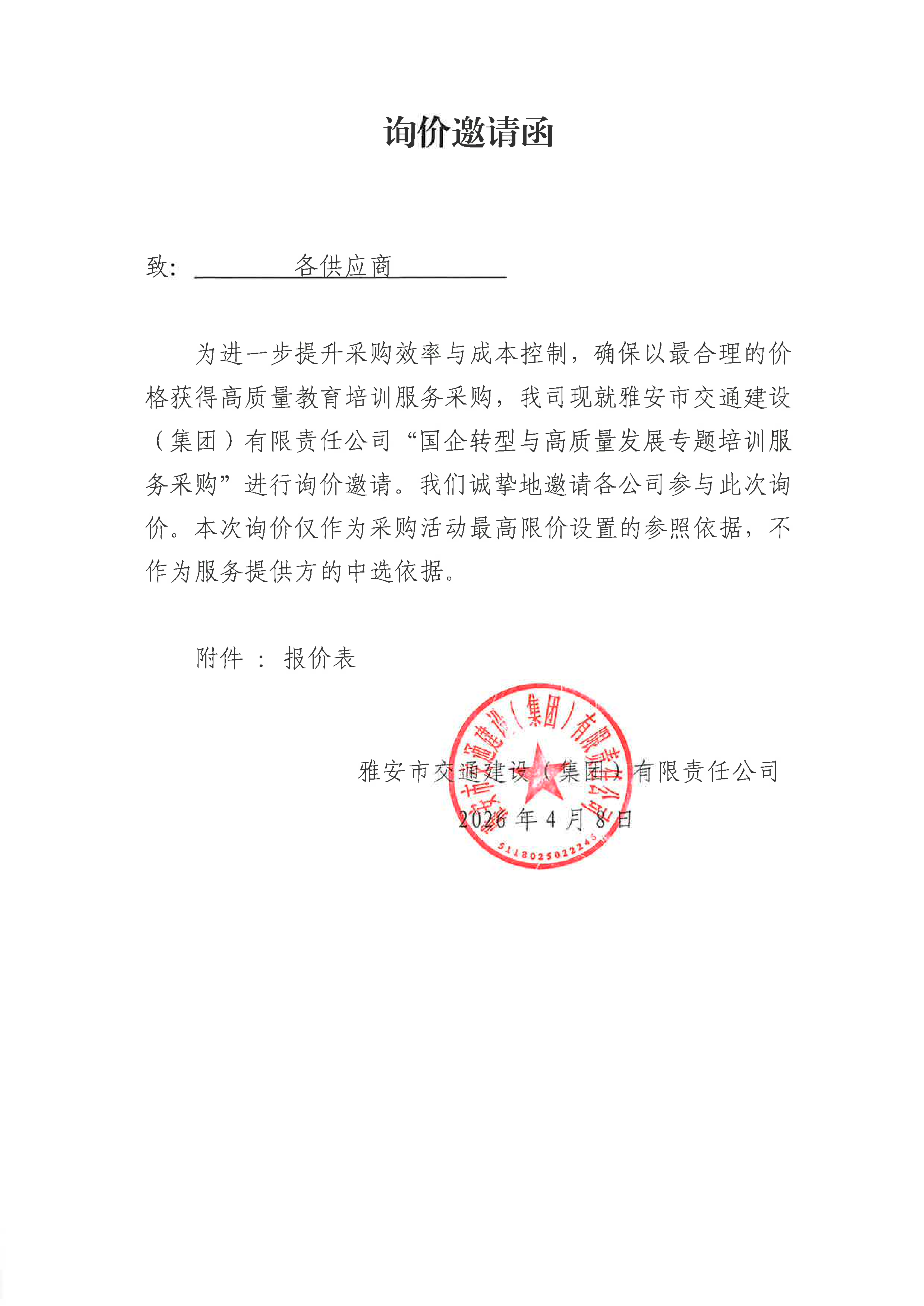 关于雅安市交通建设(集团)有限责任公司国企转型与高质量开展专题培训服务采购限价的询价函