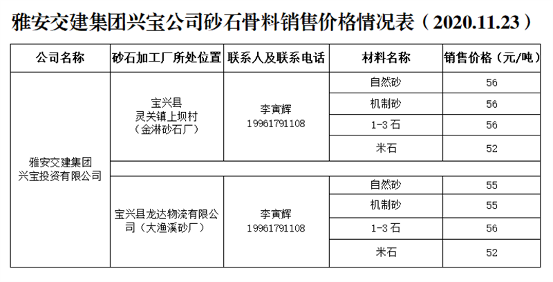 u支付集团兴宝公司砂石骨料销售价格情况表(2020.11.23)