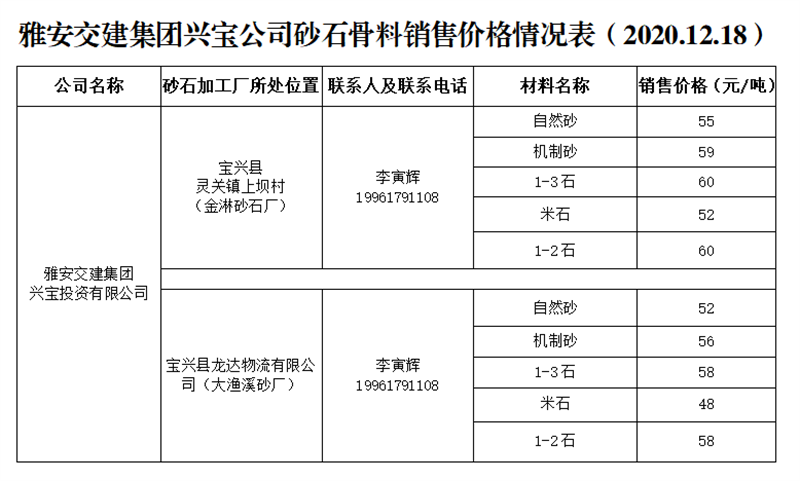 u支付集团兴宝公司砂石骨料销售价格情况表(2020.12.18)