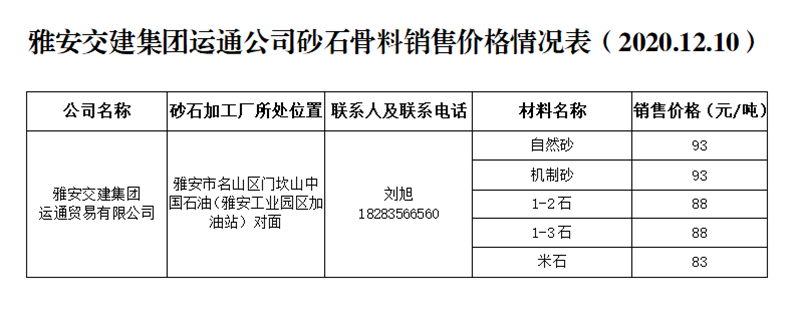 u支付集团运通公司砂石骨料销售价格情况表(2020.12.10)