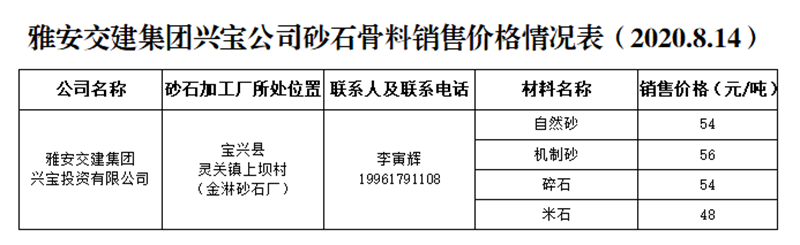 u支付集团兴宝公司砂石骨料销售价格情况表(2020.8.14)