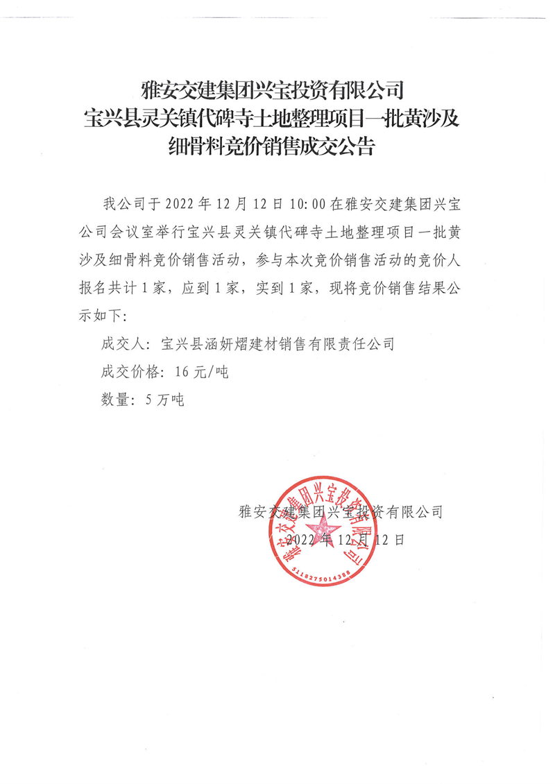 u支付集团兴宝投资有限公司宝兴县灵关镇代碑寺土地整理项目5万吨黄沙及细骨料竞价销售成交公告(2022-12-12)